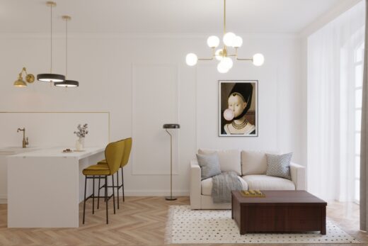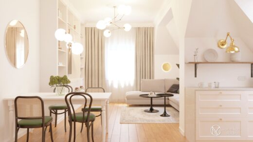 Projekt mieszkania w stanie deweloperskim. Lokalizacja: Wrocław. Rok: 2022 Mieszkanie w stylu modern classic, z eklektycznymi i humorystycznymi elementami. Zaprojektowane dla pary ludzi z poczuciem humoru. Wyróżnia się elegancją i ponadczasowością.