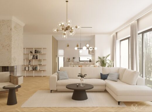 Projekt wnętrza 100m2. Lokalizacja: Dobra Szczecińska. Rok: 2022/2023 Dom w stylu modern classic z elementami stylu modern farmhouse. Wnętrze utrzymane w neutralnej tonacji, z naciskiem na naturalne materiały i ponadczasowy design.